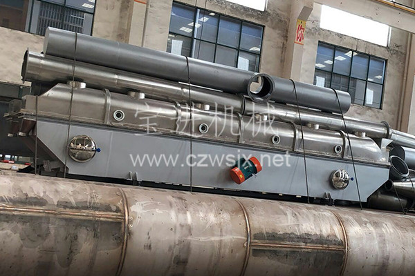 物料自進(jìn)料口進(jìn)入機(jī)內(nèi),在振動(dòng)力作用下,物料沿水平流化床拋擲,向前連續(xù)運(yùn)動(dòng),熱風(fēng)向上穿過流化床同濕物料換熱后,濕空氣經(jīng)旋風(fēng)分離器除塵后由排風(fēng)口排出,干燥物料由排料口排出。